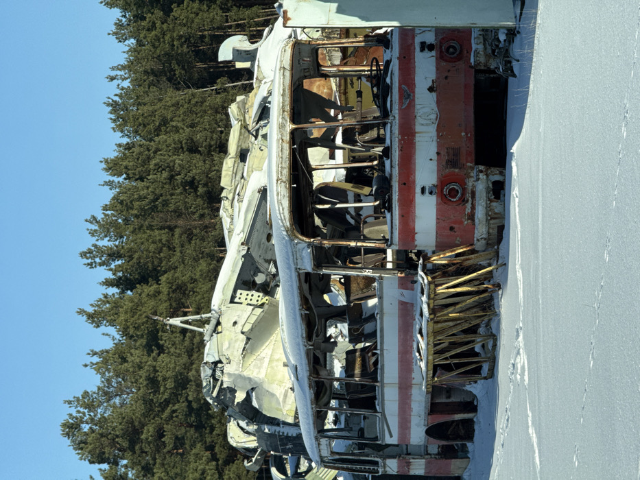 The scene depicts an outdoor salvage or storage area located in the city of Unknown, Ukraine, under a clear blue sky. The ground is covered by an undisturbed layer of white snow, with faint impressions visible in the lower foreground. Dominating the midground is a derelict, front-facing Ikarus 250 series bus, painted white with a prominent horizontal red stripe along its side. The bus is in a severe state of disrepair: most window panes are absent, interior seating is visible and appears damaged, and significant rust and structural damage are present on the body panels, especially around the front bumper, headlights (which are missing), and wheel wells. Snow lightly dusts the roof and exposed interior surfaces of the bus. To the immediate left of the bus, a fragmented, yellow-painted, angular metal or wooden structure lies partially collapsed on the snow. Behind the bus, a large mound of fragmented aircraft wreckage is visible, comprising sections of fuselage, wings, and other components, all appearing metallic grey or light green, heavily corroded, and partially covered in snow. Exposed internal structures and rivets are discernible on the aircraft debris. A dense line of dark green pine trees forms the backdrop, separating the salvage area from the clear blue sky. No individuals, actions, or interactions are present in the image.