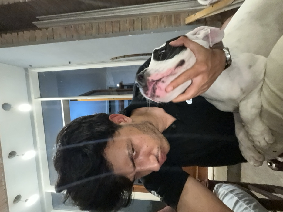 The scene depicts an adult male in an indoor residential setting, presumably located in San Fernando del Valle de Catamarca, Argentina. The male, appearing to be in his 20s or early 30s with dark hair and stubble, is wearing a black polo shirt and a metallic bracelet on his right wrist. He is holding a young, predominantly white dog with black markings on its ears and around its left eye; its muzzle is pink with dark spots. The male's left hand cradles the dog's head, while his right hand supports its body. He looks down at the dog with a focused expression. The background features a white-framed window or glass door system, allowing a view into a dimly lit interior space. Three bare bulb pendant lights illuminate the immediate area from the white ceiling. To the right of the window, a light-colored wall with vertical structures, possibly construction materials, is visible. A striped cushion is partially visible on the far left.