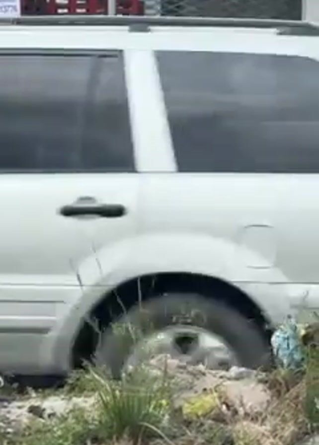 woman standing between two mannequins on a city street. The mannequins are dressed in clothing. A pink mini dress is on the left, and a white halter top and yellow capri pants are on the right. The woman, dressed in a brown patterned dress, is standing near the right mannequin, appearing to adjust the halter top. A black fanny pack is slung around her waist. A black metal gate is behind her, partially obscuring a storefront. A black and grey tuk-tuk drives past on the right side of the frame. The setting appears to be a tropical location based on the vegetation along the roadside.