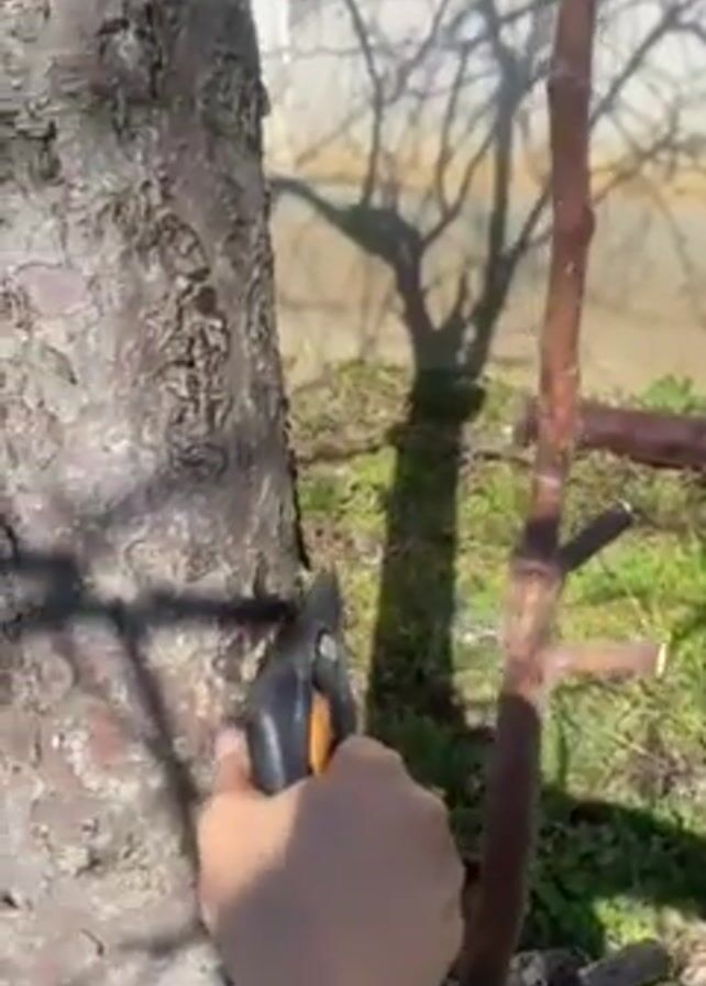 person pruning a small branch on a tree trunk with pruning shears. The tree is situated next to a larger tree. The camera pans upwards to reveal an orchard of bare trees against a background of a white wall and a clear blue sky. The ground is covered in grass and scattered branches.