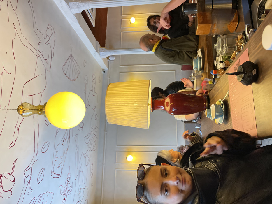 The image depicts an indoor scene within a cafe or restaurant, presumably located in Madrid, Spain. The ceiling is white with extensive red line drawings featuring stylized human figures, leaves, and a fan motif. A large, spherical yellow pendant light hangs centrally from the ceiling, and additional smaller yellow spherical wall sconces are visible on the light-colored walls, which also feature decorative molding and white fluted columns with capitals. In the foreground, a young adult female with light brown hair, wearing sunglasses on her head and a dark leather-like jacket, faces the camera. She smiles faintly and holds her right hand up with the index finger extended. Immediately behind her, to the left, an older female with grey hair, wearing a black hat and a patterned jacket, is seated at a table, looking right. A prominent table lamp with a dark red vase-like base and a ribbed, illuminated beige lampshade stands on a wooden counter that extends across the middle ground. On the counter, to the right of the lamp, are two light blue teacups on saucers, a small black teapot with a teabag tag, and several pink paper items, possibly menus. Further right along the counter, various condiment bottles, clear jars containing items like dried orange slices, and a juice extractor are present. Seated at the counter to the right of the lamp are two individuals. A balding man with a light-colored beard, wearing a dark olive jacket and a yellow and red scarf, is seen in profile facing left. To his right, a woman with dark hair, wearing a dark top, is partially visible from the chest up, facing right and extending her right hand in a pointing or gesturing motion. Other patrons are partially visible and blurred in the background.