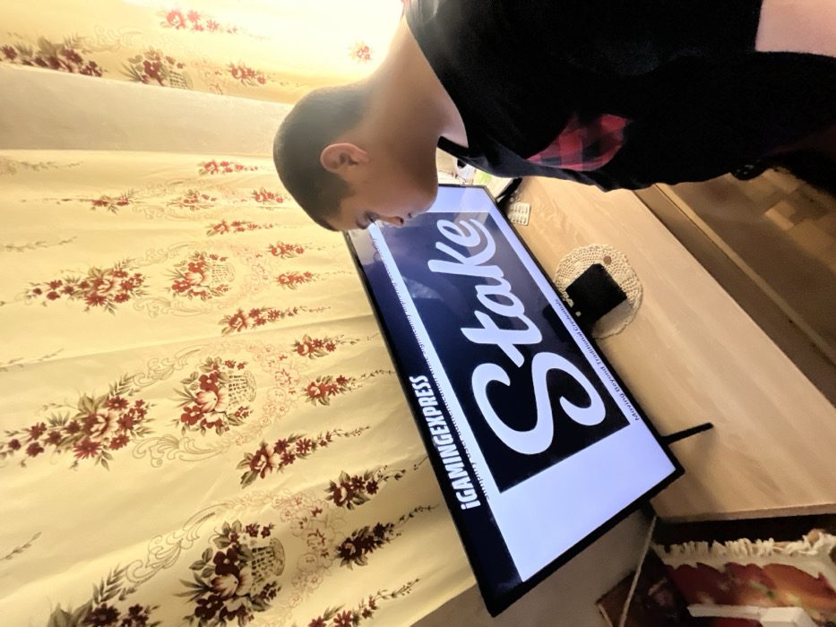 An indoor scene in Lozarevo, Bulgaria, features a young male observing a television screen. The male, seen in right profile, has short dark hair and wears a black long-sleeved shirt with a red and black plaid pattern visible on the left side of his chest. He stands to the right of a black-bezeled flat-screen television that is displaying digital content. The television shows "iGAMINGEXPRESS" at the top, a prominent white "Stake" logo against a black rectangular background in the center, and partially visible text below that reads "Moving Beyond Traditional Credentials." The television rests on a light-colored wooden or laminate surface, which appears to be a dresser or table. To the right of the television, on the same surface, a small dark electronic device, possibly a remote control or phone, rests on a circular, light-colored crocheted doily. Behind the television and the male, a light-colored curtain with a repeating pattern of red and brown floral arrangements in baskets, interspersed with scrolling vines, hangs vertically, suggesting a window treatment. A bright light source illuminates the scene, consistent with natural daylight. To the far left, a portion of a framed object with reddish and white elements is partially visible.