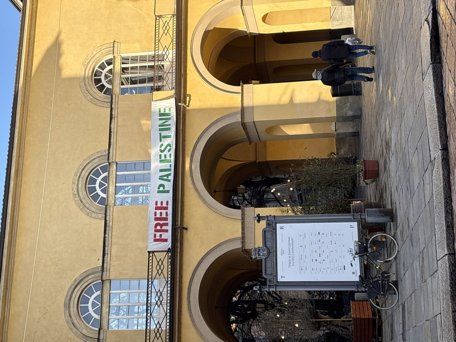 The image depicts a daytime scene in Piazza Garibaldi, Parma, Italy, featuring the yellow-ochre facade of the Palazzo del Governatore. A white banner, with "FREE" in red text and "PALESTINE" in green text, is prominently displayed across the building's upper facade, positioned below a balustraded balcony and above a series of large arched porticos. The building's upper floor features arched windows with white frames. In the foreground, a light grey stone-paved piazza extends. To the left, a large, dark-framed public information board stands, displaying Italian text, including "Grazie ai nostri partner e a tutti i sostenitori!", and various logos on a white surface. A black bicycle with white-rimmed tires and a front basket is parked beside this board. Potted green plants are visible within the archways, some with string lights draped above them. A dark public waste bin is located under an arch to the right. Two adult males are observed walking away from the camera, moving rightward under the building's portico. The individual on the left wears a dark jacket, blue jeans, and a light-colored cap. The individual on the right wears a dark jacket and dark trousers, and carries a small, light-colored object in his right hand. The scene is illuminated by direct sunlight, indicating a clear sky.