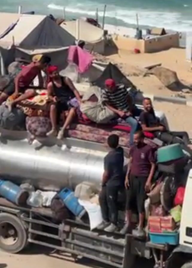 group of men sitting and standing on a truck loaded with belongings and a large metal tank. The truck is near a beach with tents visible in the background. The men are casually dressed and appear relaxed. The truck is packed with items including mattresses, blankets, gas cylinders, and household goods. The beach is sandy with waves breaking on the shore.