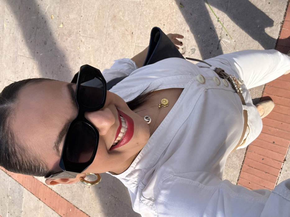 A female subject is captured in a high-angle, downward-facing selfie on a paved outdoor surface in Burjassot, Spain. She is smiling directly at the camera with red lipstick visible on her lips, and her dark hair is pulled back. She wears large, black, rectangular sunglasses and gold-colored hoop earrings. Around her neck, two necklaces are visible: one with a silver-colored S-shaped pendant and another with a circular, gold-colored medallion pendant. She is dressed in a light-colored, possibly off-white or light beige, collared jumpsuit with a V-neckline and a row of light-colored buttons down the front. A brown belt with a decorative buckle is cinched at her waist. She carries a dark-colored shoulder bag on her left side. Her feet, visible at the bottom of the frame, are clad in light beige flat shoes. The ground consists of light-colored paving stones with a contrasting strip of reddish-brown rectangular bricks running along the left side. Sunlight creates distinct shadows on the pavement to the right of the subject.
