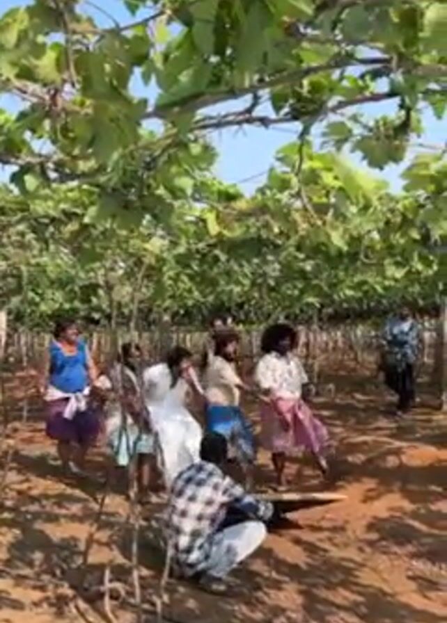 group of about 8 people dancing in a vineyard on a sunny day. Most are wearing traditional clothing, and one person is crouching on the ground in a plaid shirt. The dancers are spread out in the space between rows of grapevines. The ground is mostly bare earth. A few people are looking towards the person holding the camera, and some are clapping and moving their bodies to the beat.