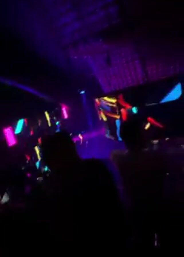dimly lit scene, likely a nightclub or concert venue. People are standing in the foreground, their silhouettes prominent against the colorful lighting of the space. Neon lights and other light displays, in hues of purple, blue, and red, contribute to the ambiance. Some lights appear to be attached to a structure in the background. The camera moves slightly, giving a sense of the dynamic environment.