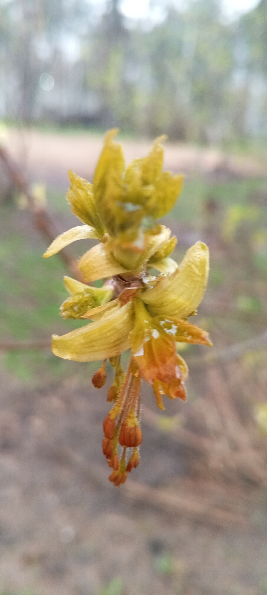 A close-up shot depicts a flowering shrub with emerging leaves and catkins. The leaves are light green to yellow, showing signs of new growth. The catkins are orange-brown and dangle from the branch. The background is blurry, with hints of green grass and brown soil. This suggests the photo was taken outdoors in a natural setting, likely within the city of Dmitrov, Russia. No people are visible in the image.