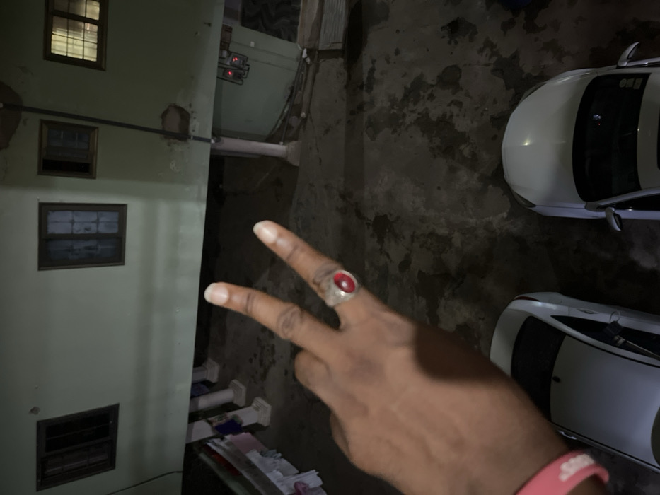 A hand flashes the peace sign, a ring with a red stone adorns the ring finger. Behind the hand, a building with several windows is visible. Two white cars are parked on a concrete surface that appears to be stained or dirty. The overall lighting is low, giving the scene a slightly grainy quality. The angle of the shot is from above, looking down.