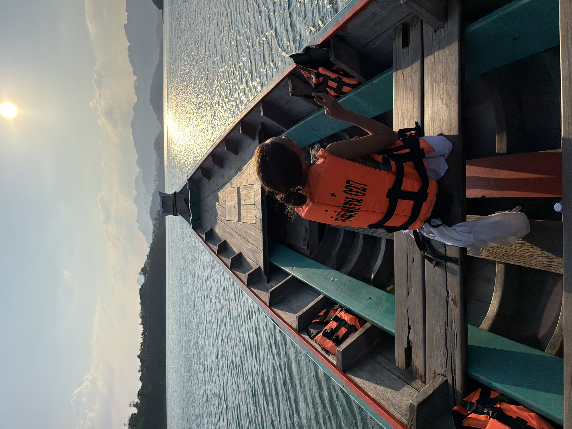 A single individual is observed from behind, seated near the bow of a wooden longtail boat on a large body of water in Cheow Lan Lake, Ban Ta Khun, Thailand. The person has dark hair tied in a bun and is wearing an orange life jacket with black straps, bearing the Thai text "ท่าเทียบเรือ 027" (Pier 027) on the back. White shorts are visible beneath the life jacket. The individual holds a black smartphone in their right hand, facing towards the boat's bow. The boat is a traditional wooden longtail design, featuring natural wood floorboards and seating, a red stripe along the gunwale, and a teal-colored lower interior hull. At least two additional orange life jackets are stowed in compartments along the boat's sides. A white plastic bag is situated near the seated individual's right side. The scene is illuminated by a bright, low-angle sun, positioned in the upper right quadrant of the image, casting a brilliant, sparkling reflection across the water surface towards the boat. The water is calm and dark blue-green. The background features several layers of distant, forested limestone karst formations and islands, characteristic of the Cheow Lan Lake environment, silhouetted against a hazy, light blue sky with scattered clouds. The overall lighting suggests late afternoon.