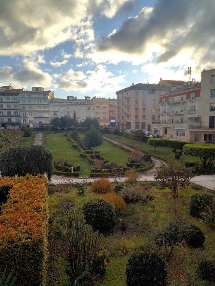 The image displays an urban garden or park situated in the city of Fátima, Portugal, observed from an elevated vantage point