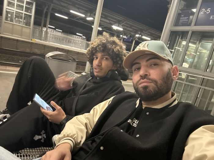 Two young men sit side-by-side on a bench at a train station. The first man has curly hair, wears a dark hoodie, and holds a phone. He appears to be speaking or gesturing with his hand. The second man wears a baseball cap and a varsity-style jacket with light-colored sleeves. The background features train tracks, station signs, and overhead lights. The photo seems casually taken, likely a selfie or by a friend.