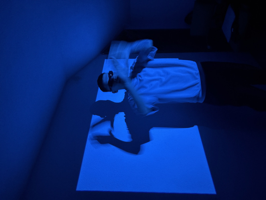 An indoor scene in a room within Patalenitsa, Bulgaria, is illuminated primarily by a stark blue light. A single male individual stands centrally, facing the viewer. He wears dark, wraparound sunglasses, a light-colored long-sleeved top, and dark pants. Both of his hands are raised and exhibit significant motion blur, indicating movement during the exposure. A sharp, dark shadow of the individual, mirroring his posture with raised arms, is projected onto a rectangular area of intense blue light on the wall to his left. The room features a sloped ceiling on the right side, suggesting an attic space. In the dimly lit background on the right, dark furniture and a faint, pale rectangular object, possibly a laptop, are discernible.