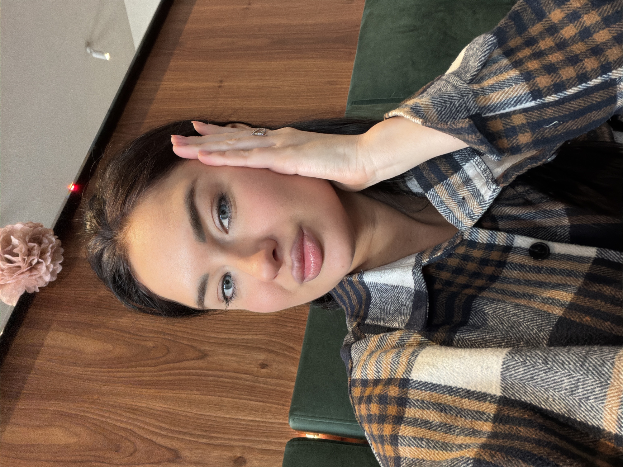 woman with light skin, dark hair, and blue eyes. She is wearing a brown and black plaid shirt and has her hand on her forehead. She appears to be indoors. A pink flower is visible on a dark surface, while the main surface appears to be light-colored wood. A section of green upholstery can also be seen. The location is not specified.