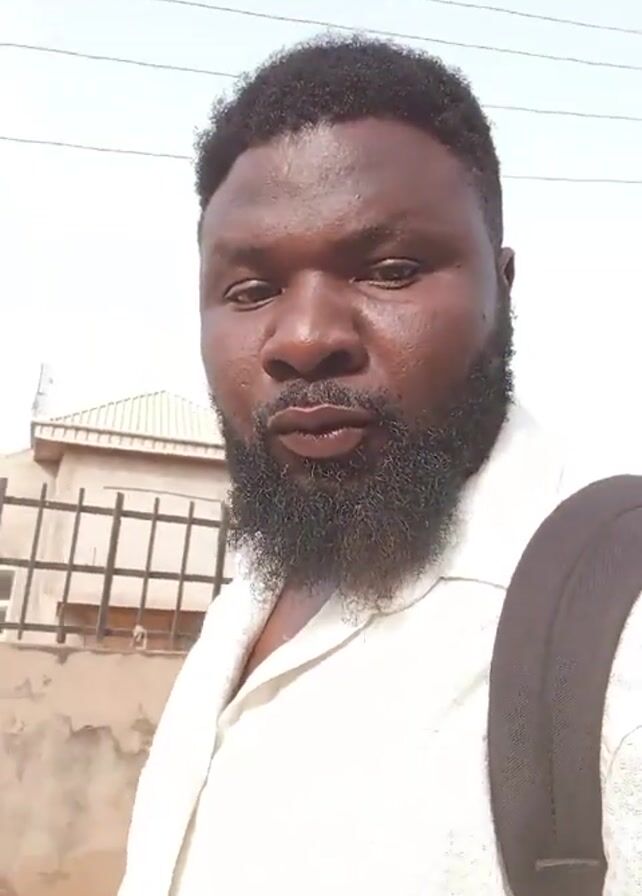 A man with a beard and short hair is walking and recording a video. He wears a white button-down shirt and a black backpack. The background includes a building, a fence, and utility lines against a bright, overcast sky.