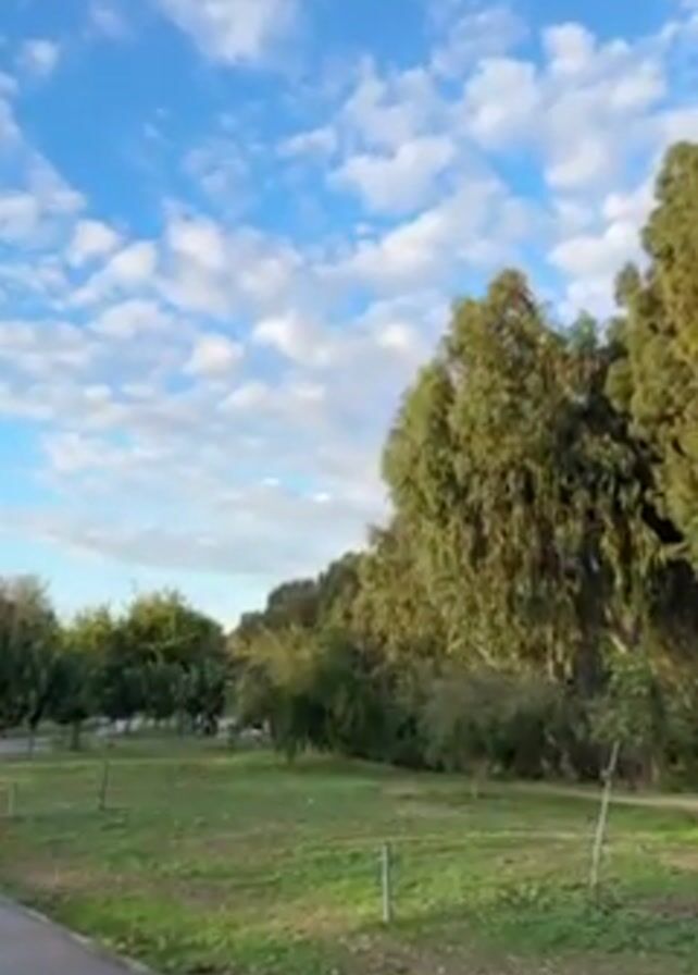 The camera pans across a park or grassy area with green trees under a blue sky filled with many small white clouds. The ground is green and brown. There is a black asphalt path on the left side of the frame. A man is talking in the background.