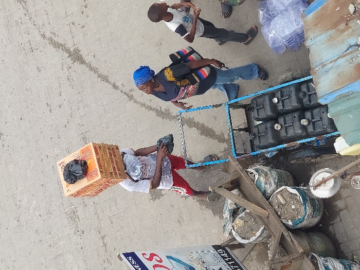 From an elevated angle, the image shows a group of people and objects on a concrete surface. A man balances boxes on his head. A woman pulls a cart filled with black containers. A child stands nearby. Discarded refuse bags and a blue and white advertisement sign are in the lower right. Bottled water is visible at the top right. The overall scene captures everyday street life.