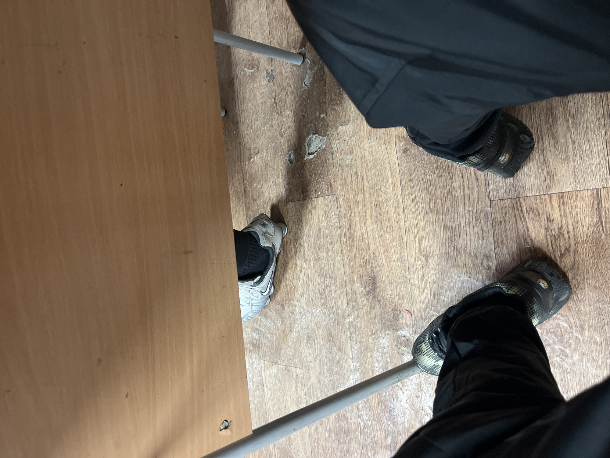 view from above, looking down at a desk and the lower portions of two individuals standing on what appears to be a wood-patterned floor. The desk is wooden, light brown, and occupies the left side of the frame. A light grey tubular support of the desk is visible under the desk. On the floor, the lower half of two pairs of legs clad in black trousers are visible. One person is wearing white/grey sneakers with black socks, the other is wearing black sneakers. The floor has some areas of damage. The image does not provide enough information to determine a specific location in Dimitrovgrad, Bulgaria, or any other specific place.
