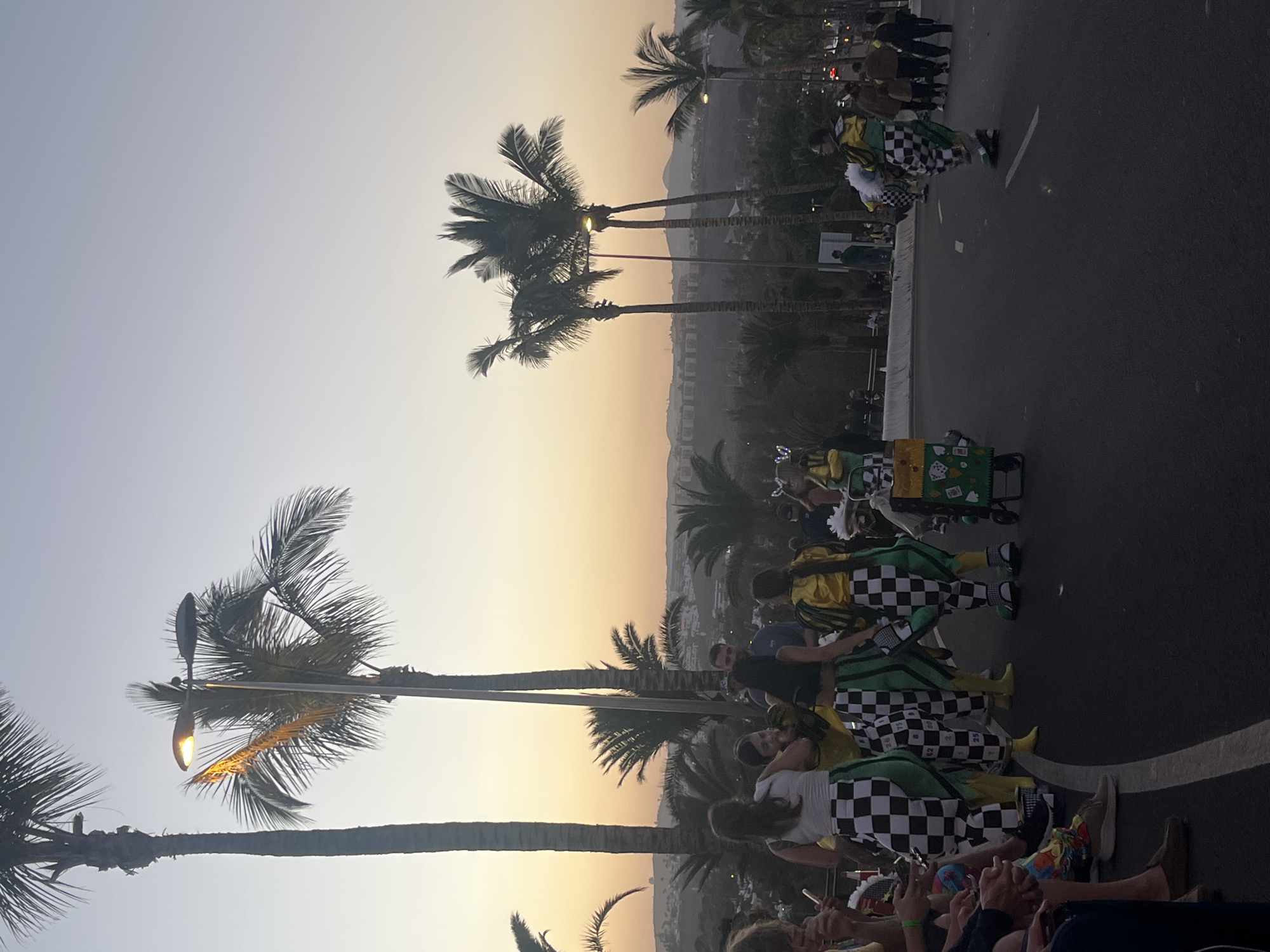 This image shows a street parade in San Bartolomé de Tirajana, Spain. People are lined up on the sidewalk watching the parade, with palm trees lining the street. Many are dressed in checkered and yellow costumes. The sky is light from what could be a sunset or sunrise. A mountainous cityscape is visible in the background.