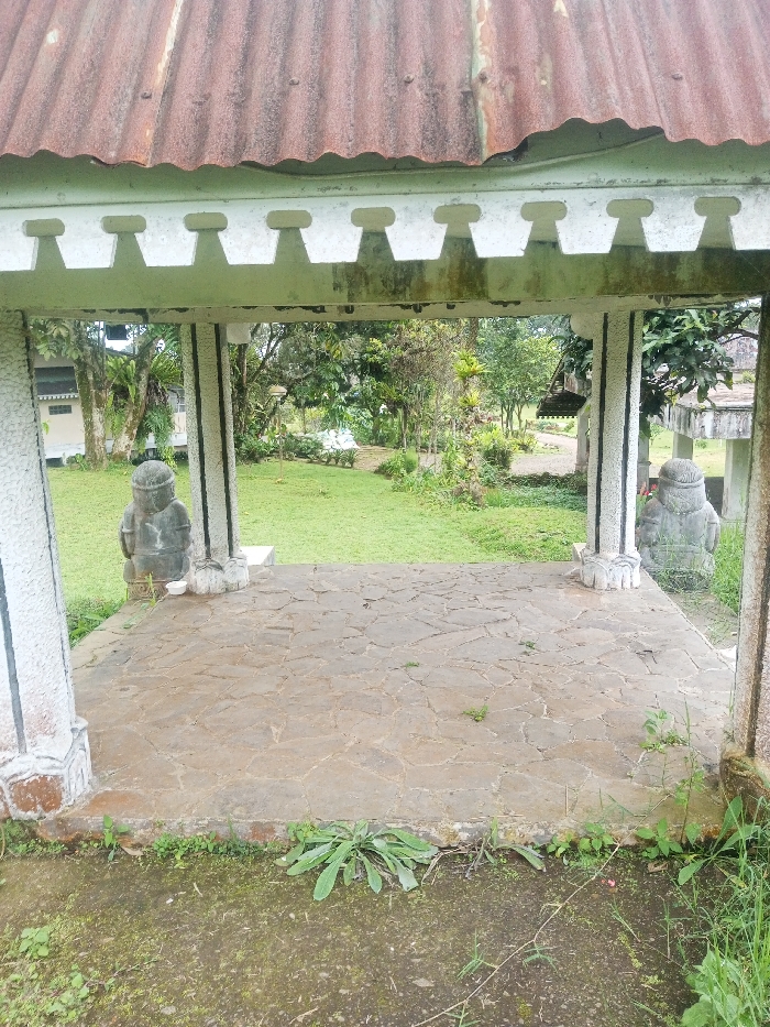 The image captures a static outdoor scene within Nghĩa Đồng Commune, Vietnam. The viewpoint is from just outside a covered structure, looking inwards and then outwards to a landscaped area. The structure's roof is constructed from heavily rusted, corrugated reddish-brown metal, supported by white-painted eaves featuring a repeating pattern of decorative geometric cutouts. Below the eaves, four concrete pillars are visible: two partially obscured front pillars and two prominent interior pillars. These pillars have textured surfaces, possibly a pebble dash or mosaic, with distinct black vertical stripes and ornate, fluted bases. The floor of the structure consists of irregularly shaped, flat gray stone slabs. Flanking the interior pillars are two squat, dark gray, stylized stone statues, positioned facing each other. A small white ceramic bowl rests on the ground beside the base of the left interior pillar. The immediate foreground outside the structure is damp, dark soil with sparse green weeds and grass. Beyond the structure, a well-maintained green lawn extends into the midground, featuring various trees, shrubs, and tropical-looking plants. A winding pathway is visible traversing the lawn, and a light pole stands on the left side of the garden. In the background, partially obscured by dense foliage, are other buildings, including a light-colored structure with multiple windows on the far left. The sky is overcast. No people are present in the scene.