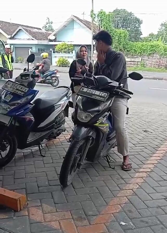 A young man in a gray sweater and light beige pants stands next to a black Honda motorcycle parked on a brick sidewalk near a road. He is fiddling with something on the motorcycle's dashboard. A young woman wearing a hijab and gray pants stands next to him, looking at the same area. There's another parked blue and white Honda motorcycle to their left. In the background, across the road, are houses and greenery. A person in a reflective vest is visible further away on the left side of the frame. The scene appears to be outdoors during the day.