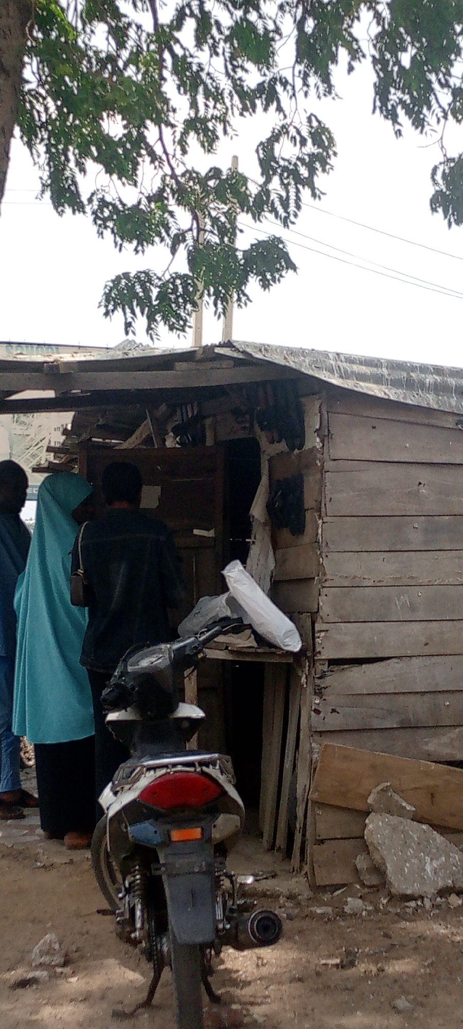 The image depicts a small, weathered wooden structure in Adankolo, Nigeria. Three individuals are visible; one is partially obscured on the left, another wears a blue hijab, and the third is clad in a dark jacket. All three face the structure's entrance. A motorcycle is parked in the foreground, its rear end towards the camera. The structure appears to be a small shop, with items hanging near the entrance. The environment is dusty, with debris scattered on the ground. Above, a tree canopy partially obscures the sky. Power lines are visible above the roofline.