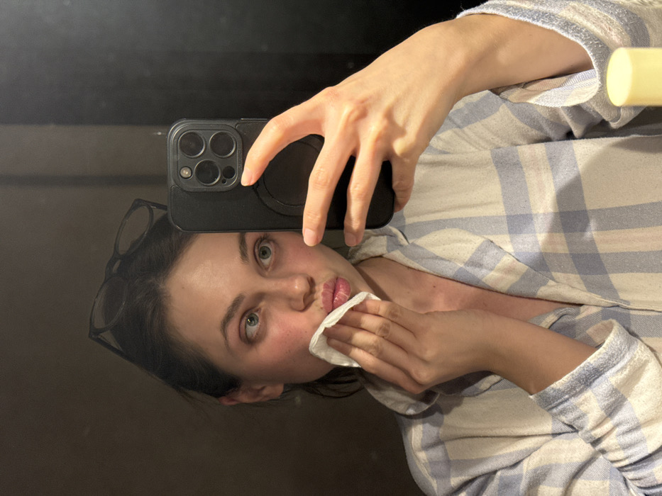 A female subject, appearing to be a young adult, is depicted in a mirror selfie. Her head and torso are visible, with dark hair pulled back and dark-rimmed glasses resting on top of her head. She has light-colored eyes and flushed cheeks. She wears a blue and white plaid long-sleeved shirt. Her right hand holds a black smartphone, equipped with a triple-lens camera array and a circular magnetic accessory, capturing her reflection. Her left hand holds a white, circular cotton pad against her lower lip and chin area, while her lips are pursed in a pouting expression. The background behind the subject's reflection is uniformly dark and indistinct, suggesting an interior space. A small portion of a light-colored bottle or container is visible on a surface in the lower right corner of the image. The specific location within Fiuggi, Italy, is not identifiable from the visual content.