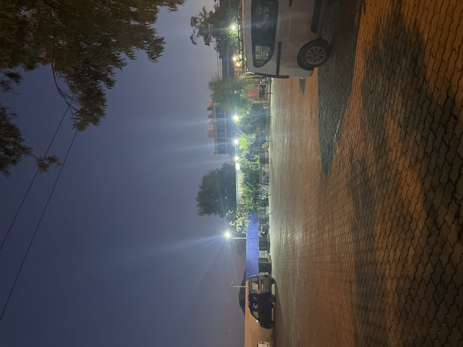 A night scene displays a paved parking lot with vehicles. A white van is parked at the top and a dark car is below. Streetlights illuminate the scene, with the background featuring trees and what appears to be a building. The sky is dark, possibly at dusk or early evening. The pavement is constructed of patterned bricks. Vegetation is visible near the center of the frame, contributing to the outdoor ambiance.