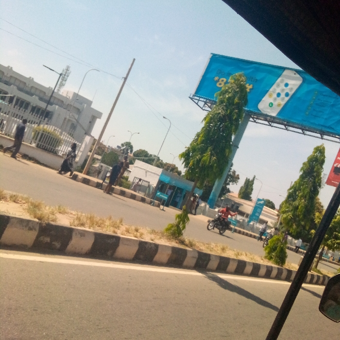 The image presents an outdoor street scene in Shaba, Nigeria, under a clear, bright sky. The perspective is from within a vehicle, with a dark frame element visible along the bottom and lower right quadrant. A multi-lane asphalt road spans the foreground and midground, featuring a median strip with black and white striped curbs and sporadic, dry vegetation. On the left side of the road, a large, light-colored multi-story building with a perimeter fence is visible. Two individuals are present on a sidewalk adjacent to this building: one person in dark clothing walks left, while another, also in dark attire, walks right. A tall utility pole stands on this side of the road. Further down, a smaller light-blue structure, possibly a kiosk or booth, is visible, with several indistinct figures near it. On the right side, a large blue billboard is positioned above the road, displaying a white smartphone image and the text "*8#". Several tall, slender green trees with dense foliage are interspersed, some in front of the billboard structure. Below the billboard, two motorcycles are on the road; one individual on a red motorcycle, wearing a red shirt, is visible in the midground, moving right. A second motorcycle is further down the road. A portion of a vehicle's side-view mirror is partially visible in the bottom right corner.