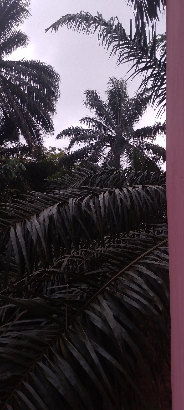 A photograph showcases a dense cluster of palm trees against a muted sky. The fronds, dark and heavy, fill the foreground. A glimpse of a pink structure anchors the right edge. The composition suggests a tropical, possibly overcast, setting. The perspective appears to be from a low vantage point, looking upwards into the canopy of palm trees.