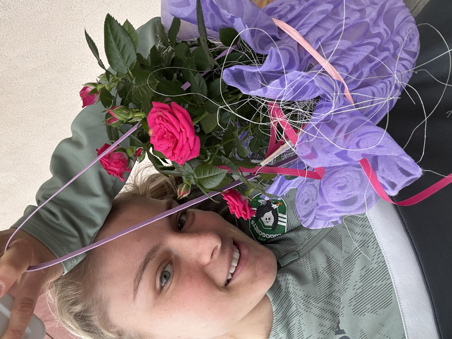 The image displays a close-up view of a Caucasian female smiling directly at the camera. She has blonde hair and light-colored eyes. She is wearing a light green long-sleeved athletic-style top with a subtle patterned texture and a partial zipper at the neck. On her right upper arm, a circular patch is visible, featuring the text "PFC LUDOGORETS" above a black-and-white cartoon animal mascot with three white stripes. The female is holding or positioned next to a potted plant containing several vibrant fuchsia-pink roses and rosebuds, along with green leaves. The plant's pot is wrapped in translucent purple material with a swirling pattern, accented with pink ribbons and fine white decorative strands. A thin, light purple string, likely a handle, is held by her right hand, visible at the top center. The background is an out-of-focus, plain, light-colored wall. No specific location within Krupnik, Bulgaria, is discernible from the visual information provided.