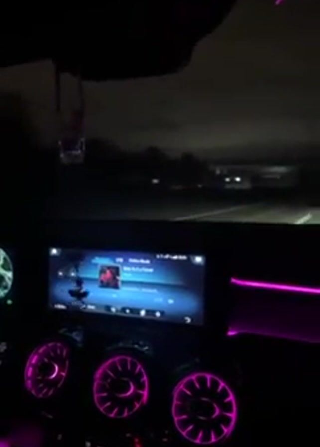 interior of a car driving at night, focusing on the dashboard. The car's infotainment screen displays music, and the air vents are illuminated with pink light. The car is driving on a highway, visible through the windshield. The environment is dark, with occasional streetlights and the headlights of other cars. The scene has a modern, stylish aesthetic due to the car's interior design and the ambient lighting.