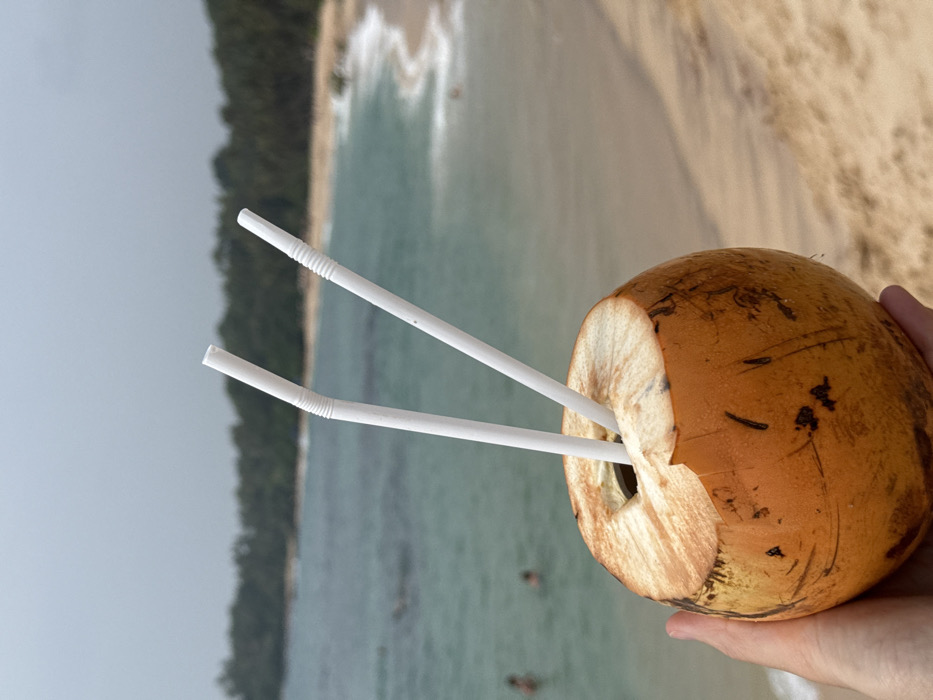 A ripe, golden coconut with two white straws juts into the frame, held in a hand