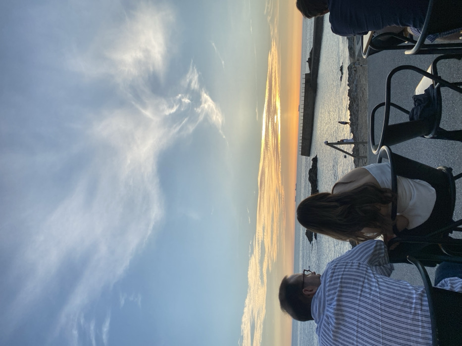 This image displays a coastal scene at dusk in Aldoar, Foz do Douro e Nevogilde, Portugal. In the foreground, three individuals are observed from behind, seated in dark metal chairs and facing the ocean. On the left, a male subject wears a light-colored striped shirt and eyeglasses. To his immediate right, a female subject with long dark hair is seated, wearing a white strapless or off-shoulder top. A third individual, partially visible on the far right, wears a dark shirt. The mid-ground features the ocean extending to a rocky and sandy shoreline. A concrete pier or breakwater, equipped with a dark railing, projects into the water on the right side of the frame, forming a contained water area, consistent with a tidal pool. A single small human figure is discernible standing on the rocky shore near the water's edge. The horizon line reveals several ships at sea. The sky exhibits a gradient from light blue in the upper frame to distinct orange and yellow tones at the horizon, characteristic of a sunset. White, wispy cirrus clouds are scattered across the sky.