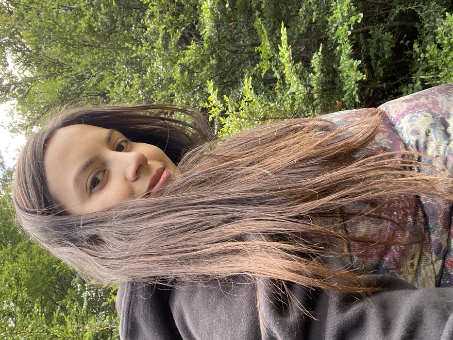 A woman with long brown hair poses outdoors, partially obscuring her face