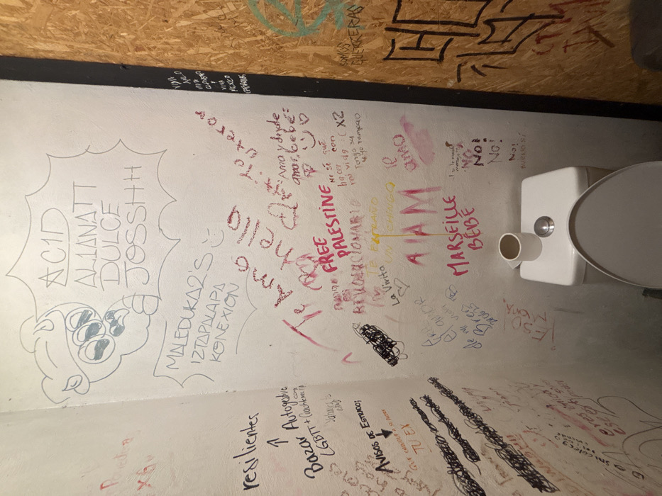 graffitied restroom wall. The walls are covered with various scribbles, messages, and drawings in different colors. Prominent phrases include "ACID ALIANATT DULCE JOSSHH," "FREE PALESTINE," "MARSEILLE BEBE," and "AAM." Other writings appear to be in Spanish. A white toilet is positioned to the right, indicating this is indeed a restroom. The graffiti appears to be layered, with newer messages overlapping older ones, creating a chaotic yet expressive texture.
