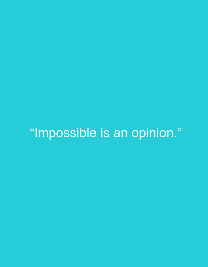 A light teal background fills the frame. Centered horizontally and vertically is the white text, "Impossible is an opinion." The text is enclosed in quotation marks. The overall aesthetic is clean and minimalist, with the focus solely on the statement presented.