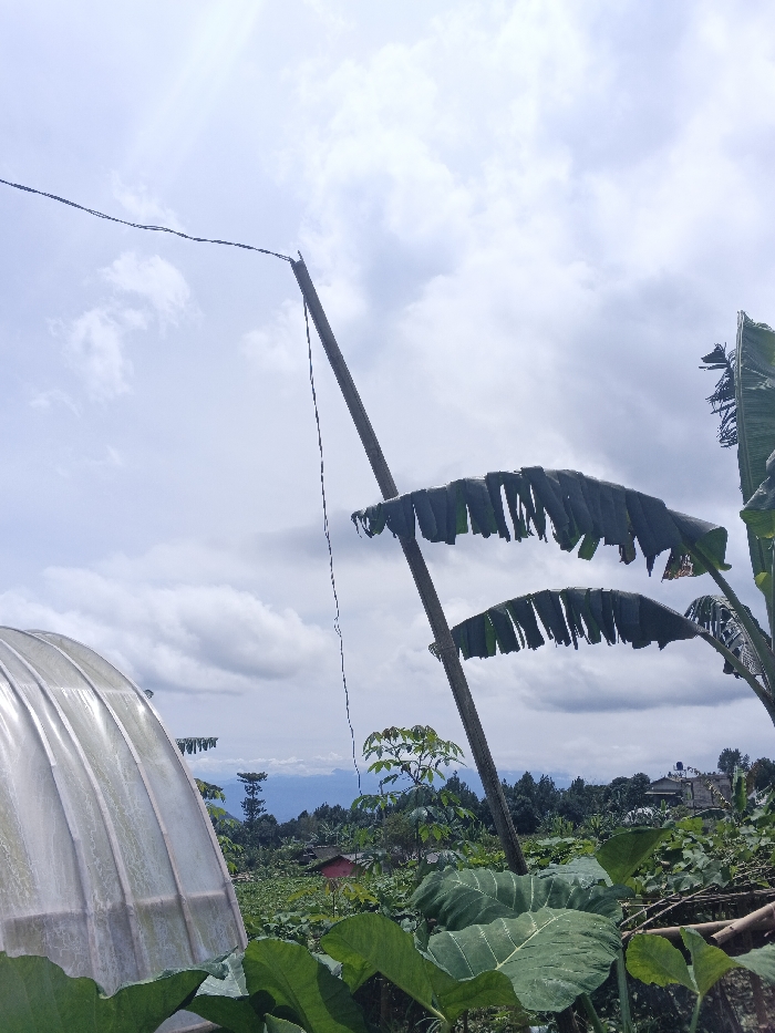 The image displays an outdoor agricultural environment in ឃុំ ផាត់សណ្ដាយ, Cambodia, under an overcast sky. The upper two-thirds of the frame are dominated by a light blue sky with extensive, diffuse white and grey cloud cover. In the lower-left quadrant, the curved, translucent plastic roofing of a tunnel greenhouse is visible. Extending diagonally from the upper-left towards the mid-right is a tall utility pole, from which a dark electrical or communication wire is strung horizontally, and another wire hangs loosely downward. To the right of the pole, several large, green banana leaves, appearing somewhat weathered and torn, are present. The foreground and midground are densely vegetated with various green plants, including large, broad-leafed plants in the immediate foreground. Further back, numerous trees and shrubs form a dense canopy. A small structure with a red roof is partially visible amidst the foliage in the midground. Distant hills or mountains are faintly discernible on the horizon beneath the clouds. No people or animals are visible within the scene.