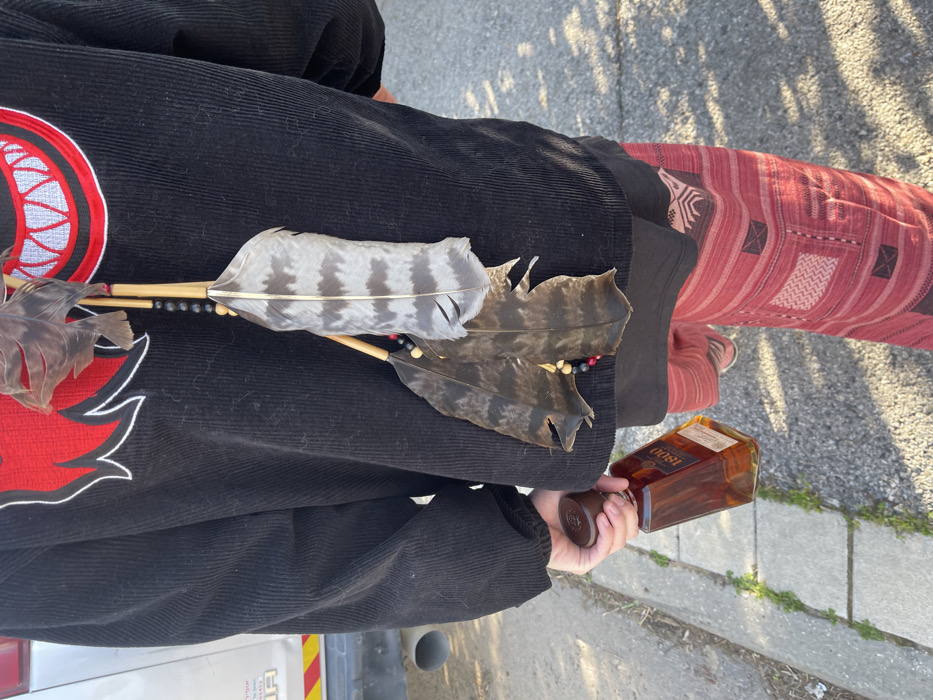 The image captures a person from the chest down, positioned outdoors in Zikhron Yaakov, Israel. The individual wears a black corduroy long-sleeved shirt with a prominent red and white stylized design resembling teeth or flames on the left chest area. Attached to the left side of the shirt are three distinct feathers, two dark brown/black and one light grey with dark horizontal stripes, strung with wooden beads on thin wooden sticks. Beneath the black shirt, a black undershirt is visible, followed by red pants patterned with geometric designs in lighter and darker red tones. The person's right hand holds a clear, rectangular glass bottle of 1800 Tequila, containing an amber-colored liquid and sealed with a dark brown stopper. In the immediate background, to the left, the rear bumper of a light-colored vehicle with yellow and orange reflective stripes and partial Hebrew text is visible. The ground is paved with asphalt or concrete, bordered by a concrete curb alongside a narrow strip of earth containing sparse green vegetation.