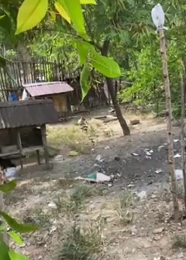 cluttered yard with several ducks walking around. There are three ducks visible in the frame, all of a similar breed with white and black markings. They appear to be near a small water trough or container. The ground is a mix of dirt, grass, and some debris. In the background, there are small, makeshift structures with corrugated metal roofs, possibly sheds or coops. Some trees and greenery are visible, providing a partial canopy over the area. The overall impression is that of a rural or semi-rural setting with a somewhat untidy yard.