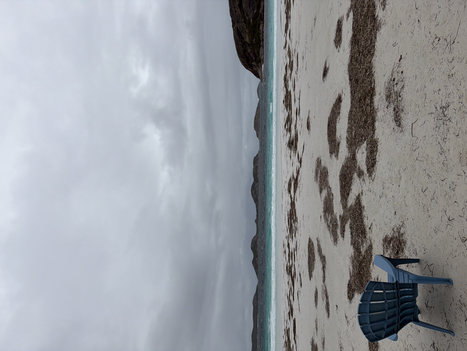 The image displays a coastal scene within Cape Le Grand, Australia. The sky is completely overcast with dense, grey clouds. In the foreground, a white sand beach is visible, extensively covered with irregular patches of dark brown marine vegetation. A single, unoccupied dark teal plastic Adirondack-style chair is positioned in the lower left quadrant of the image, facing towards the water. Beyond the beach, turquoise ocean waves break, leading to darker blue waters. A series of dark, rounded landmasses, consistent with islands or headlands, are visible along the horizon line. No individuals or active subjects are present in the scene.