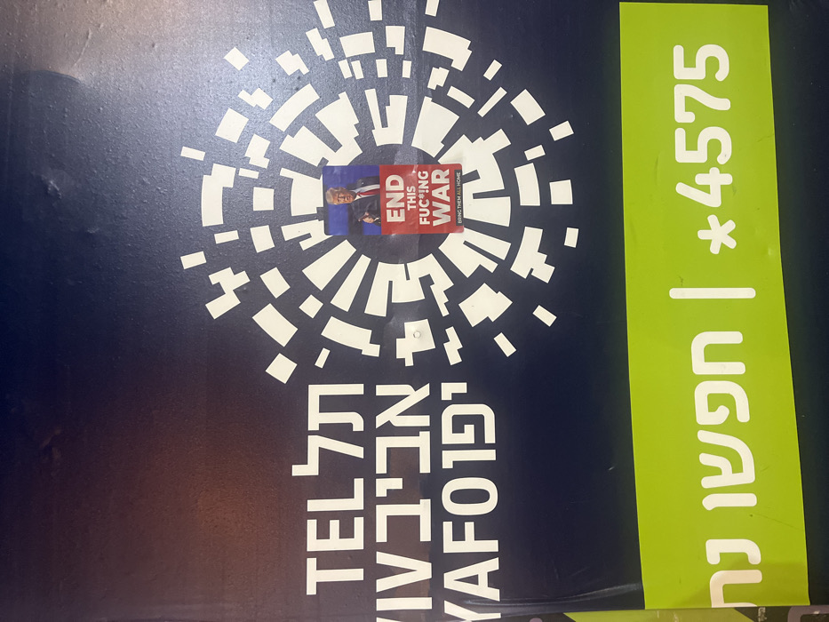 The image displays a close-up of a dark blue informational panel or sign, confirmed to be in Tel Aviv-Yafo, Israel, by prominent white Hebrew "תל אביב יפו" and English "TEL AVIV YAFO" text on the upper left
