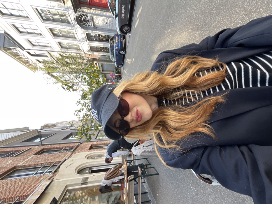 - "A young woman with long, wavy reddish-blonde hair, wearing a dark New York Yankees baseball cap and dark oval sunglasses, poses for a selfie in the foreground" by FM-VYYYD2, licensed under CC BY 4.0