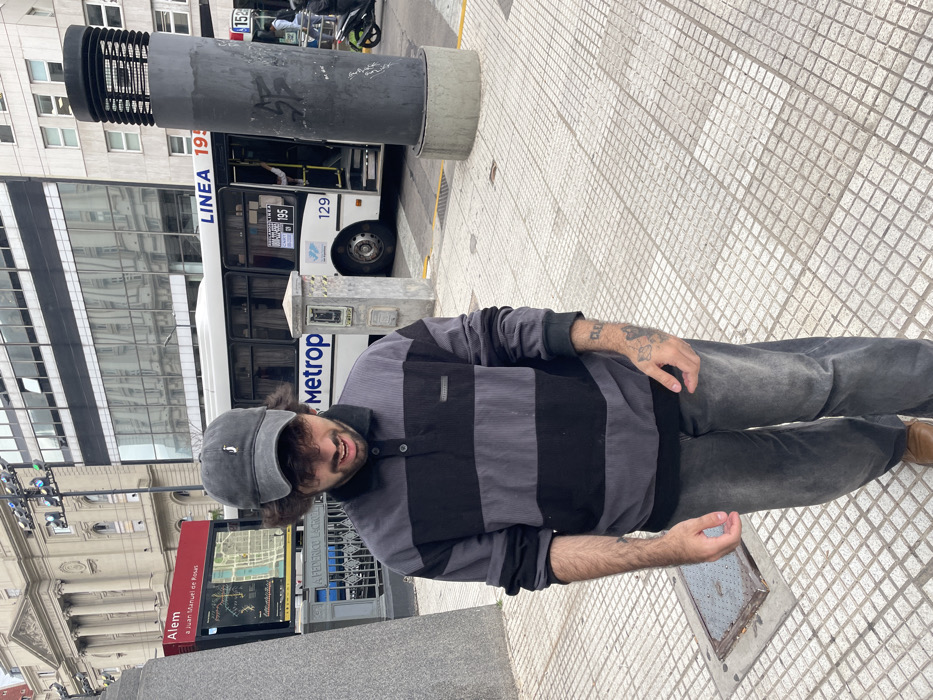 An individual is depicted walking on a tiled urban sidewalk in the city center of Buenos Aires, Argentina, specifically near the Leandro N. Alem Metrobus station. The male subject, approximately 20-35 years old, has dark, curly hair visible under a dark grey baseball cap with a white logo. He wears a dark grey and black striped long-sleeved corduroy-like polo shirt and dark grey baggy jeans, with brown shoes visible at the bottom of the frame. Tattoos are visible on both forearms, including the word "CLEO" on the left arm. He is looking downwards and slightly to his left, with an open-mouthed expression suggesting a laugh or smile. In the mid-ground, a white "LINEA 195" city bus, marked with "129," is stopped with its front door open, indicating a passenger stop. A "Metrobus" sign is visible nearby. To the left of the bus, a red rectangular overhead sign displays "Alem" and "a Juan Manuel de Rosas" with a map, indicating a subway or bus transfer point. A tall, dark grey cylindrical pole with a grated top stands to the right of the bus, showing minor graffiti. The background features a grand, light-colored classical building with columns and arches on the far left, and a modern multi-story building with horizontal dark stripes and reflective windows in the center. The street, partially visible behind the bus, indicates an active urban environment. The lighting suggests an overcast sky. A metal utility cover is present on the sidewalk in the lower-left foreground.
