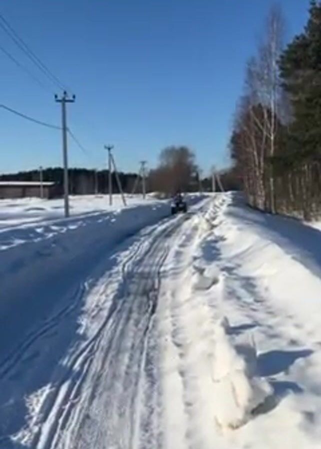 n ATV driving down a snowy path on a bright, sunny day. Power lines run parallel to the road, which is flanked by trees and snowdrifts. A building is visible in the distance. The camera appears to be following the ATV.