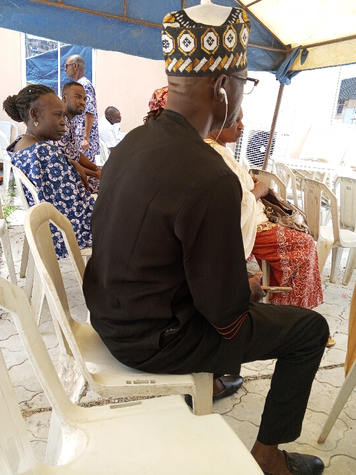 This image captures an outdoor gathering in Otite, Nigeria, under a blue and white canopy. In the foreground, a man is seated facing away from the viewer, shown from his right side. He wears a dark, vertically striped shirt with orange stitched cuffs, dark trousers, and black slip-on shoes. He has a traditional cap featuring geometric patterns in black, white, gold, and brown. White in-ear headphones are visible, and he wears glasses. To his left, a woman with braided hair and hoop earrings is seated in a blue and white patterned dress. Beside her, a bearded man stands in a blue and white patterned shirt. To the main subject's right, a woman in a light-colored top and red patterned skirt holds a light-colored handbag on her lap. Other individuals are partially visible in the mid-background, including a man standing in a blue and white patterned shirt and another person seated. All visible participants are seated on white plastic chairs arranged on an outdoor surface paved with interlocking blocks. The scene is brightly lit under natural daylight.
