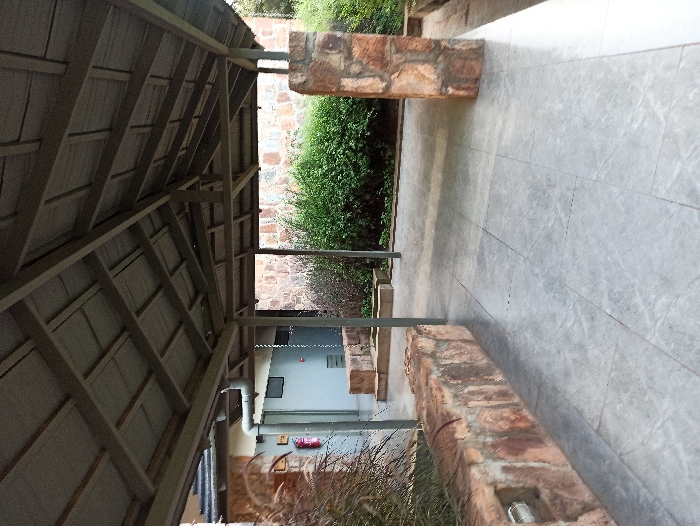 A shaded walkway features a wooden roof structure, open on the sides. Rectangular brick structures line the pathway, with greenery and shrubs visible between them. The tiled walkway appears grey and textured. Further down the walkway, glimpses of a building with gray walls and a door are seen. A small red object hangs on the wall of the building. Tall grass and foliage are at the end of the walkway.