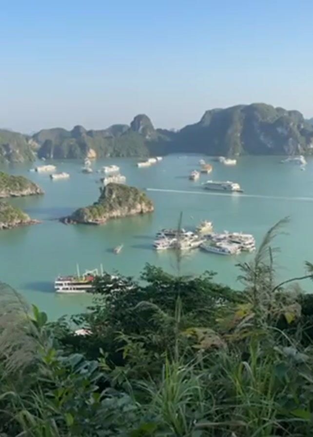 The scene is a high-angle shot of a bay with many small islands and numerous boats and ships. The water is a greenish-blue color. The islands are covered in green vegetation. The sky is clear and blue. In the foreground, there is some green vegetation, partially obscuring the view of the bay. The boats are of various sizes and types, mostly white, scattered throughout the bay, some appearing docked together. There is no visible human activity in the video.