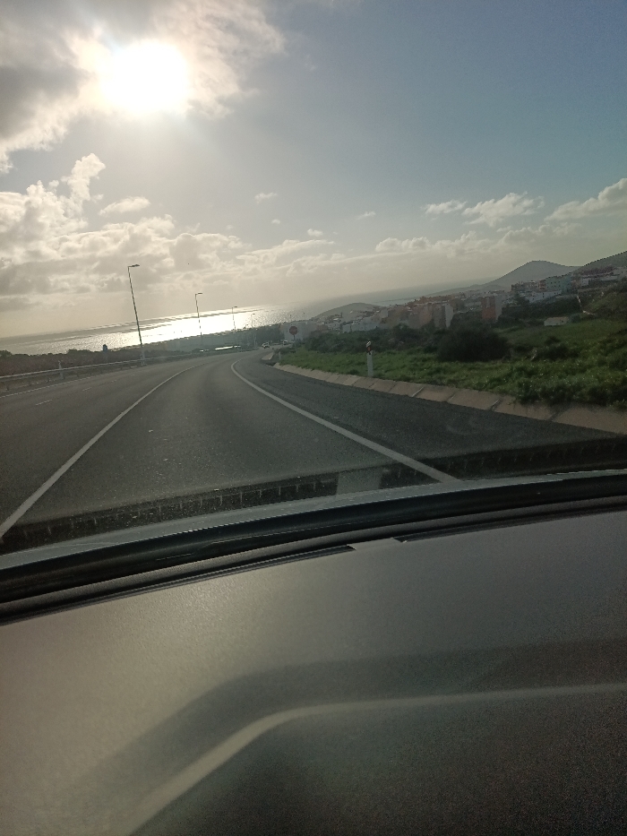 The image provides a forward-facing view from inside a vehicle, showing a paved road curving gently to the right under a partly cloudy sky. The sun, positioned brightly on the upper left, casts a strong glare, particularly on the sea visible to the left of the road. Several streetlights line the left side of the roadway, which appears to have a barrier or guardrail separating it from the coastline. On the right side, a grassy embankment borders the road, beyond which a cluster of residential buildings is visible against a backdrop of hills. A red octagonal "STOP" sign is partially discernible on the right shoulder of the road, alongside a white and red reflective post. The dashboard of the vehicle is visible at the bottom of the frame. No individuals are depicted, and no specific actions are occurring beyond the implied movement of the vehicle from which the photograph was taken. The scene is located within the city of Ingenio, Spain.