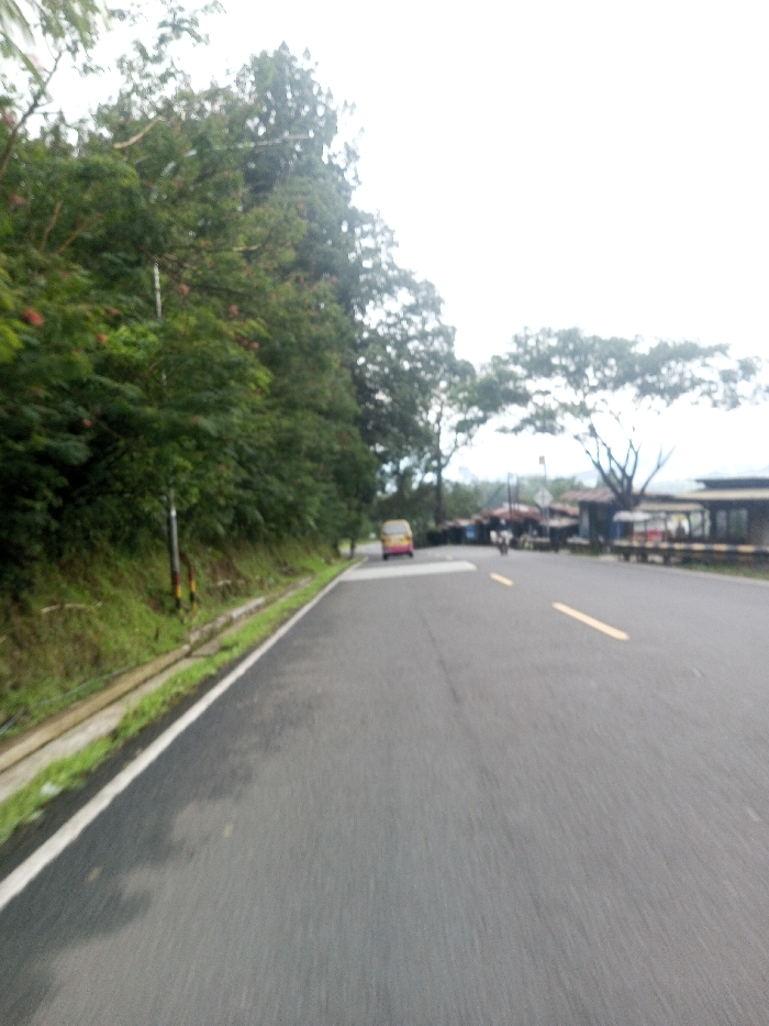 The image depicts a paved, dark gray asphalt road in Deothang, Bhutan, under a bright, overcast sky. The viewpoint is low, looking forward along the road. On the left side, a concrete drainage ditch separates the road from a grassy verge and a steep, densely vegetated hillside covered with green trees, bushes, and some visible reddish blossoms. A utility pole is situated on this slope. The road surface appears damp in patches and is marked with a solid white line on its left edge and two broken yellow lines in its center, indicating two-way traffic. In the mid-ground, a yellow and pink van is visible on the right side of the road, facing away from the viewer. Further down the road, on the right, a cluster of small, rustic buildings with corrugated roofs suggests a market or commercial area. Faint figures, possibly on a motorcycle, are discernible near these structures. A horizontal barrier is partially visible on the far right. No distinct human actions or interactions are clearly observable.